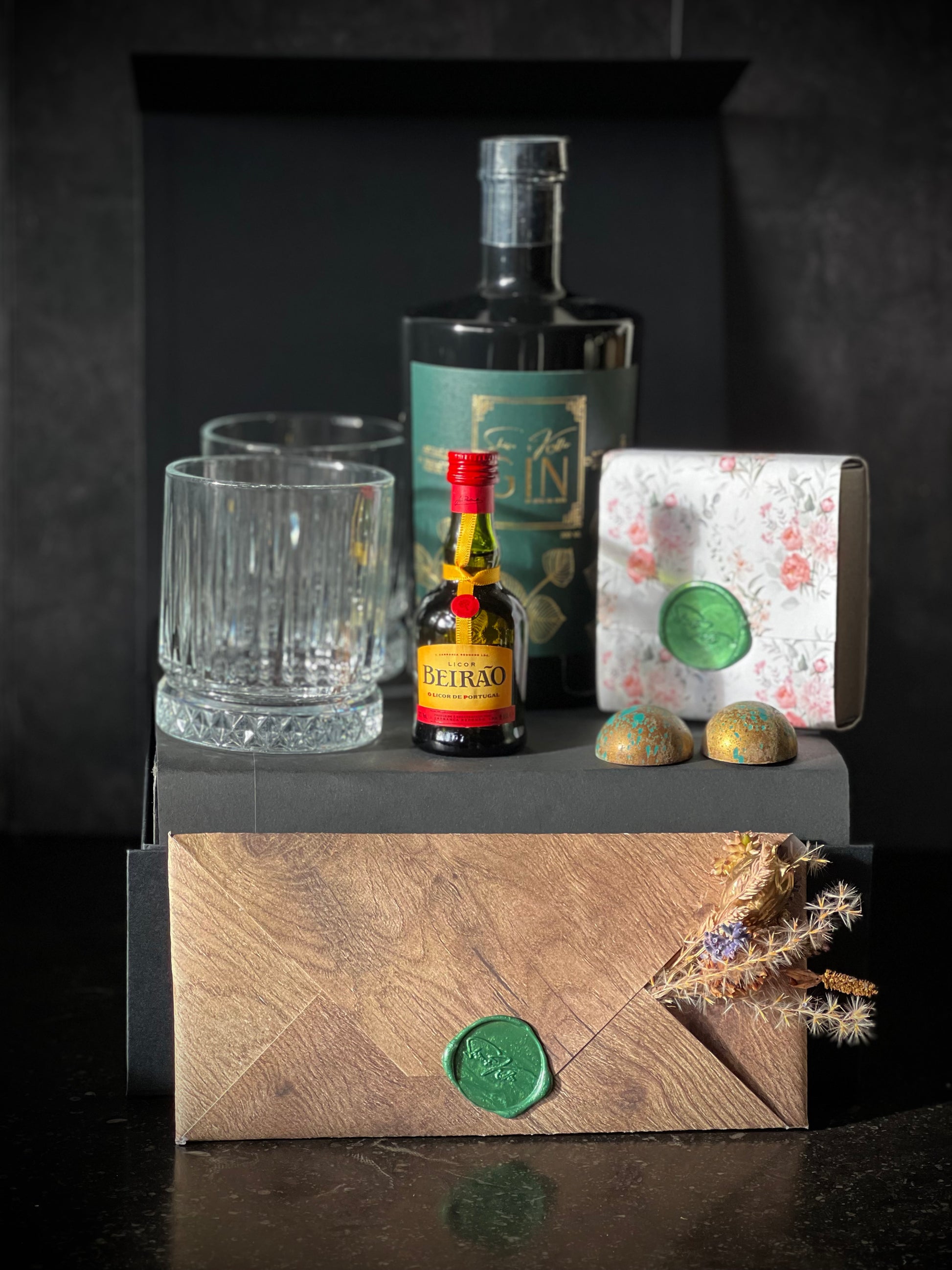 Luxury box including :1 Shiso & Kaffir , 2 glasses, 1 mini bottle of Beirão, and 4 Shiso & Kaffir chocolate bonbons.